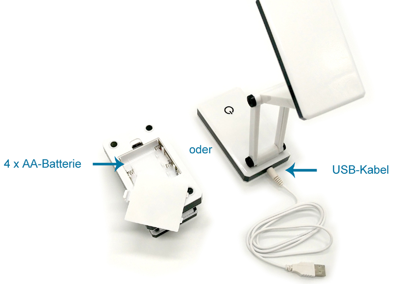 Betrieb wahlweise per USB oder 4× AA Batterien