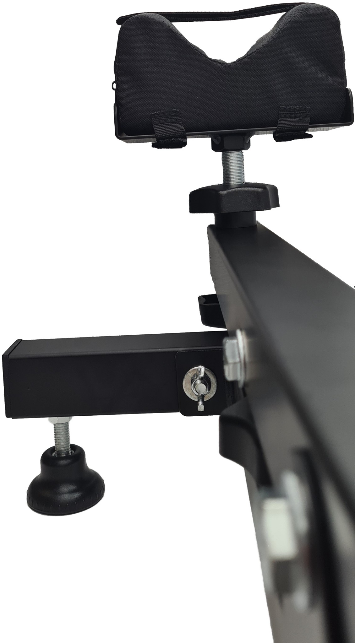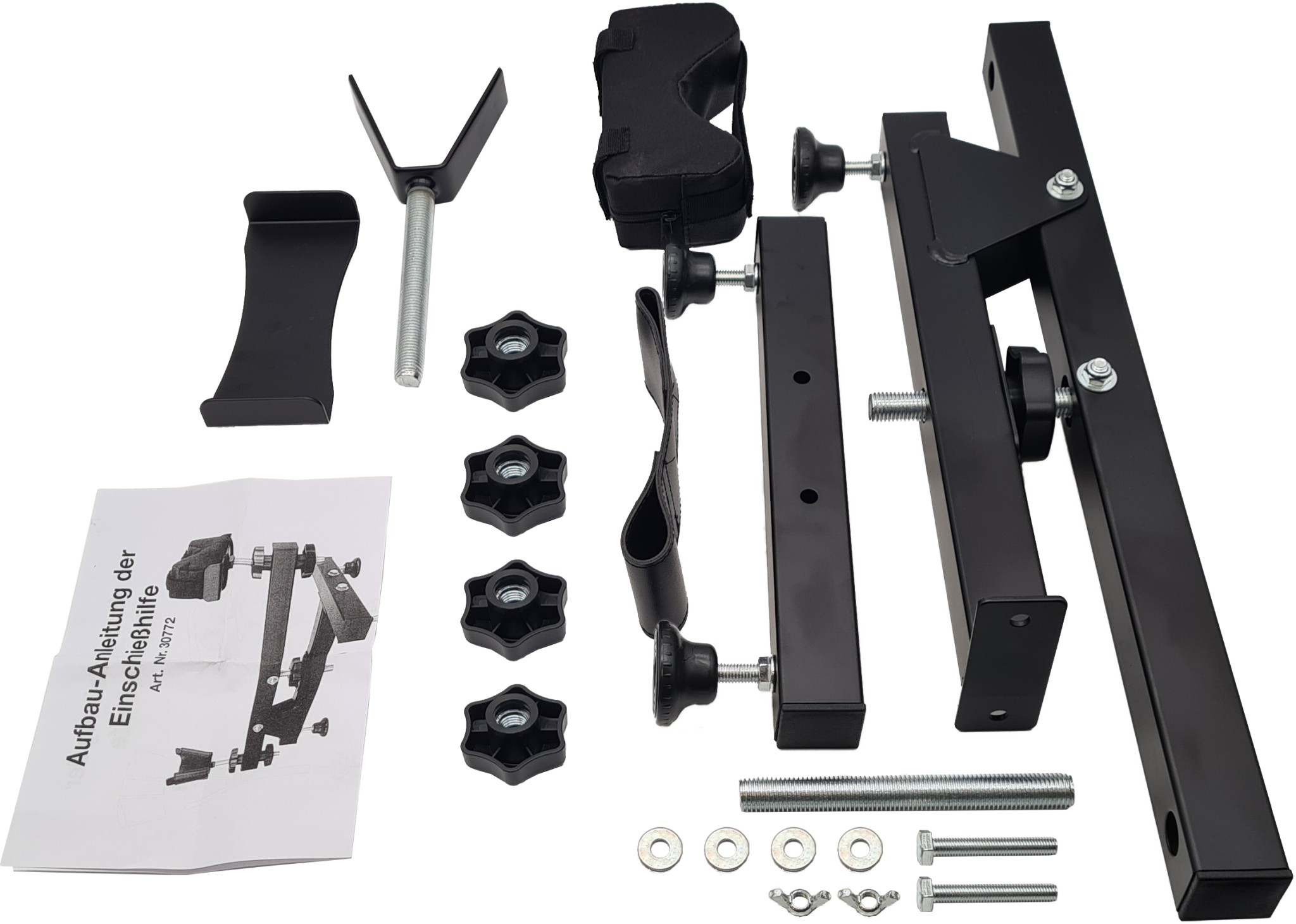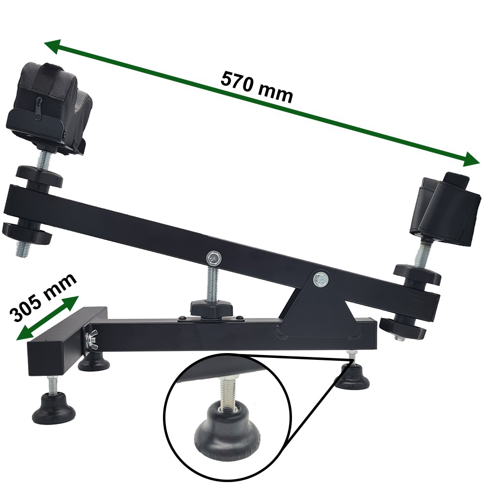 Präzisions-Einschießhilfe aus hochfestem Stahl, Dreibeinausführung einzeln höhenverstellbar um jeweils 20 mm, Schaftauflage (mit Schießkissen) zusätzlich über 2 Gewindespindeln, ca.100 mm höhenverstellbar, stabile Auflagen zum Finden der optimalen Schießposition, Maße ca. LxBxH = 70x29x39 cm, Mit ausführlicher Montageanleitung.